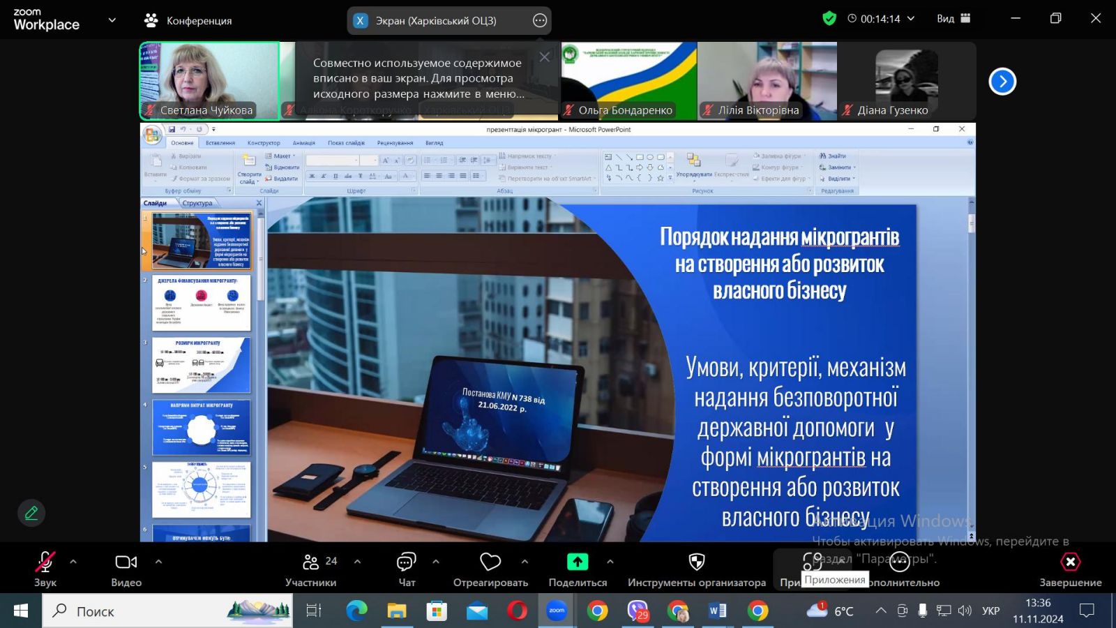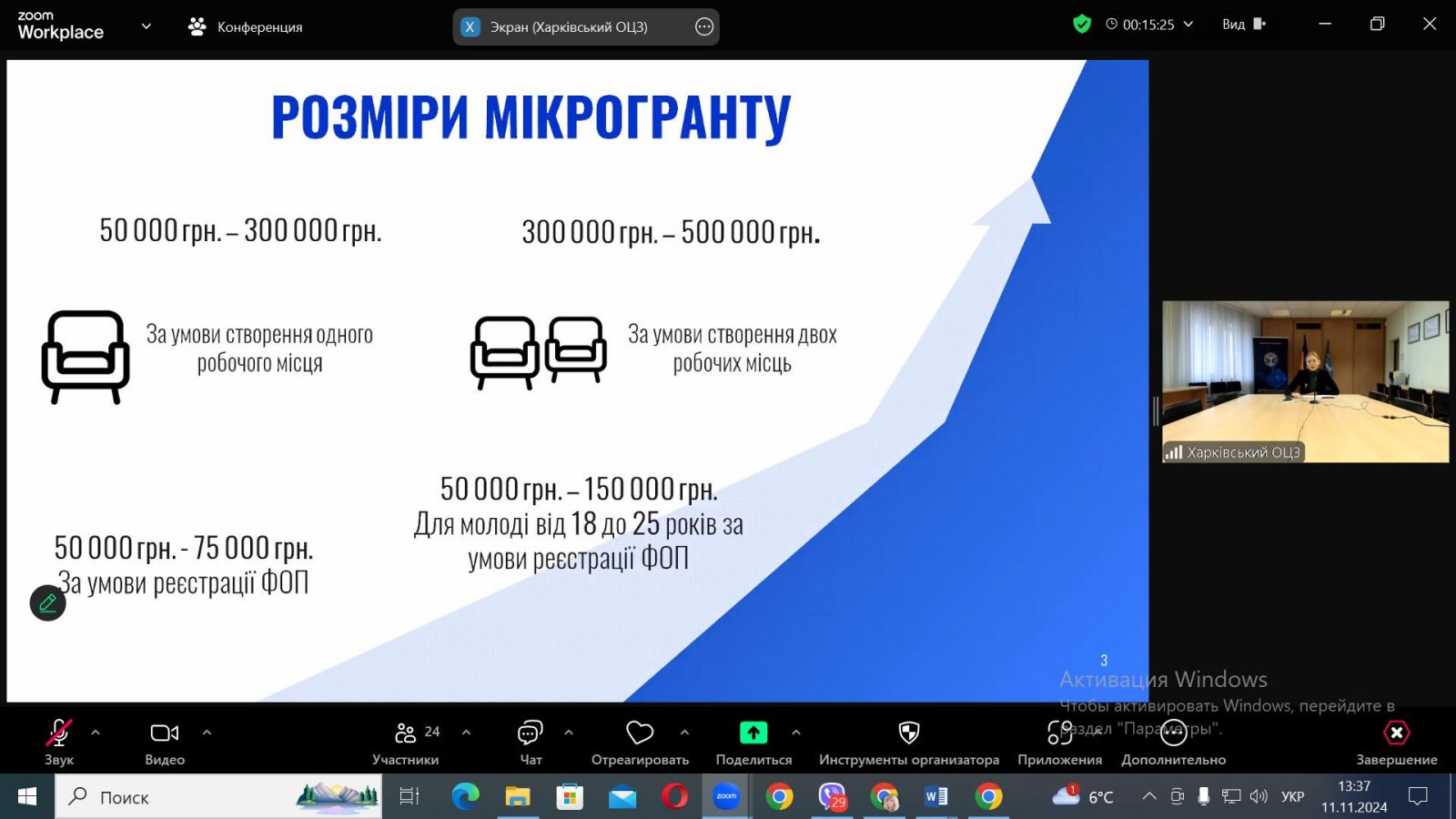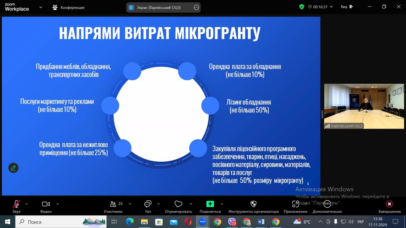 Під час заходу, начальник відділу реалізації проєктів ХОЦЗ Олена Ніколаєва, ознайомила учасників із можливостями отримання мікрогрантів для створення або розвитку власного бізнесу. Детально розглядалися питання порядку подання заявок, умов участі, критеріїв відбору, напрямів використання коштів, а також вимог до отримувачів фінансування.