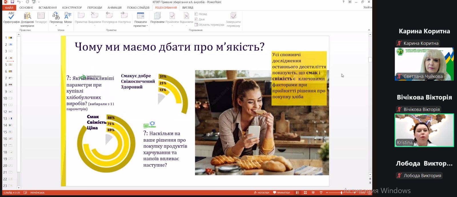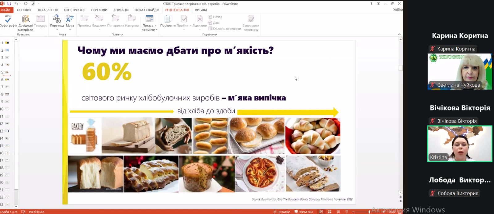 У межах лекції Крістіна СЛЄПЧЕНКО поділилася практичними знаннями про: інноваційні технології у хлібопекарстві; застосування емульгаторів для уповільнення ретроградації крохмалю; фактори, що впливають на мікробіологічне псування виробів; роль пакування у забезпеченні тривалого терміну зберігання.