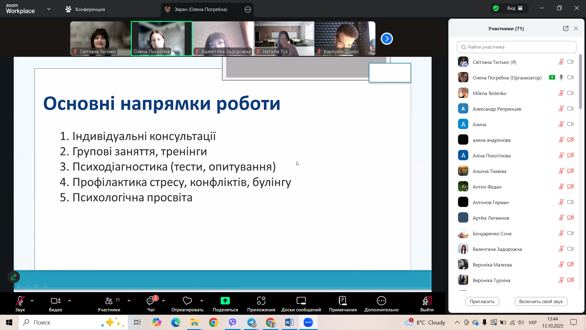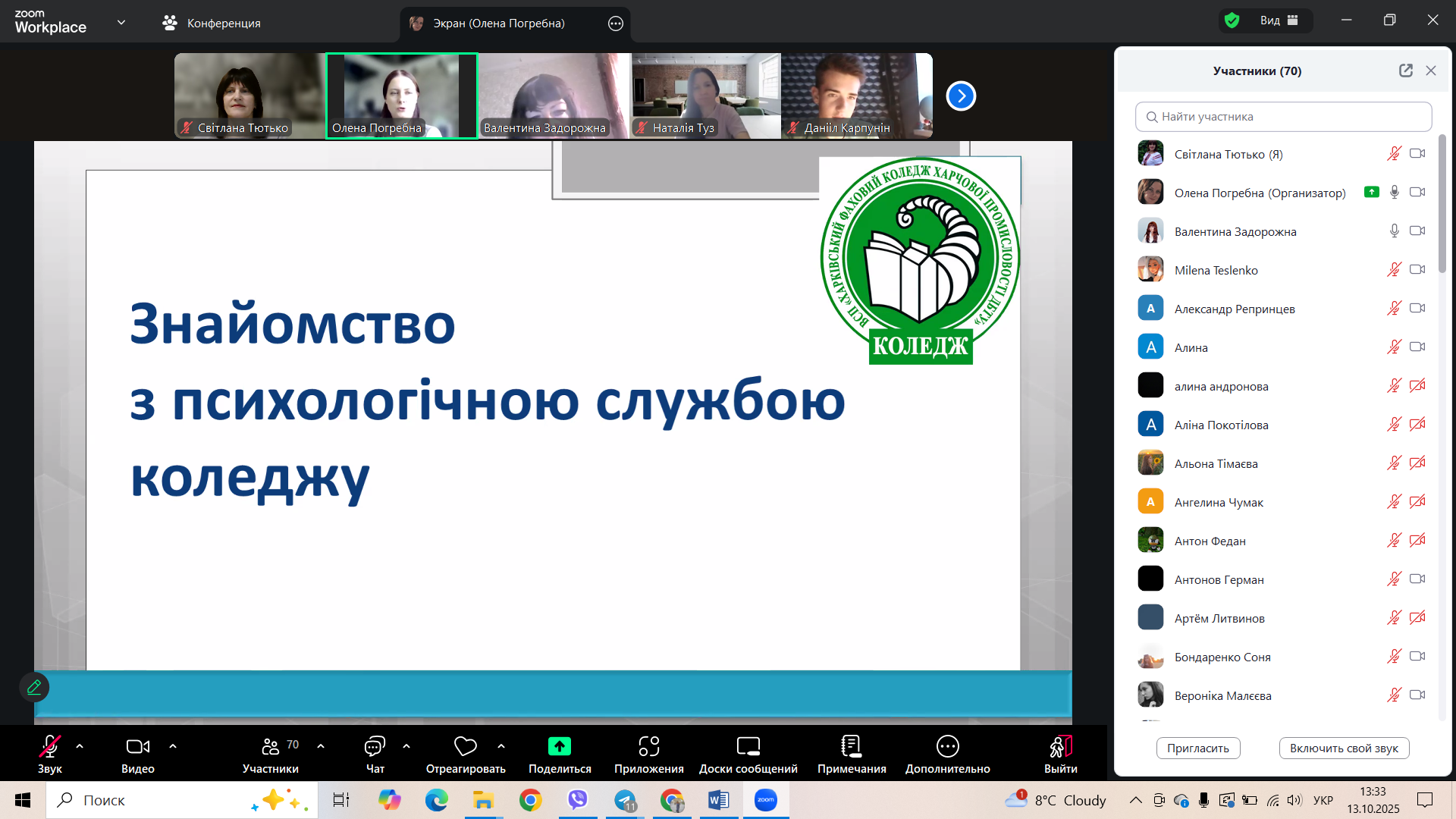 13 жовтня 2025 року на платформі Zoom відбулась онлайн-зустріч студентів 1 курсу із працівниками соціально-психологічної служби коледжу – Погребною Оленою Юріївною, практичним психологом, і Тютько Світланою Михайлівною, соціальним педагогом.