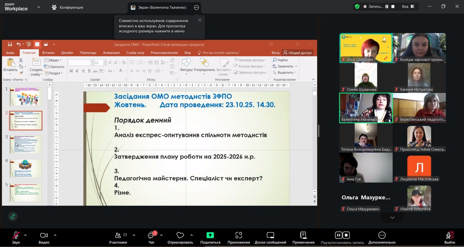 Перша частина засідання мала нормативно - компетентісний напрям. Було проведено аналіз результатів експрес-опитування спільноти методистів, обговорено і затверджено план роботи на рік, визначено варіанти тем до щорічної Обласної науково-методичної конференції педагогічних працівників ЗФПО Харківської області. З кількох пропозицій найбільше прихильників отримали дві теми :