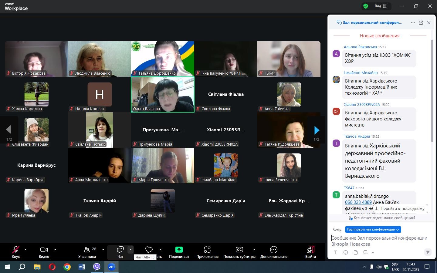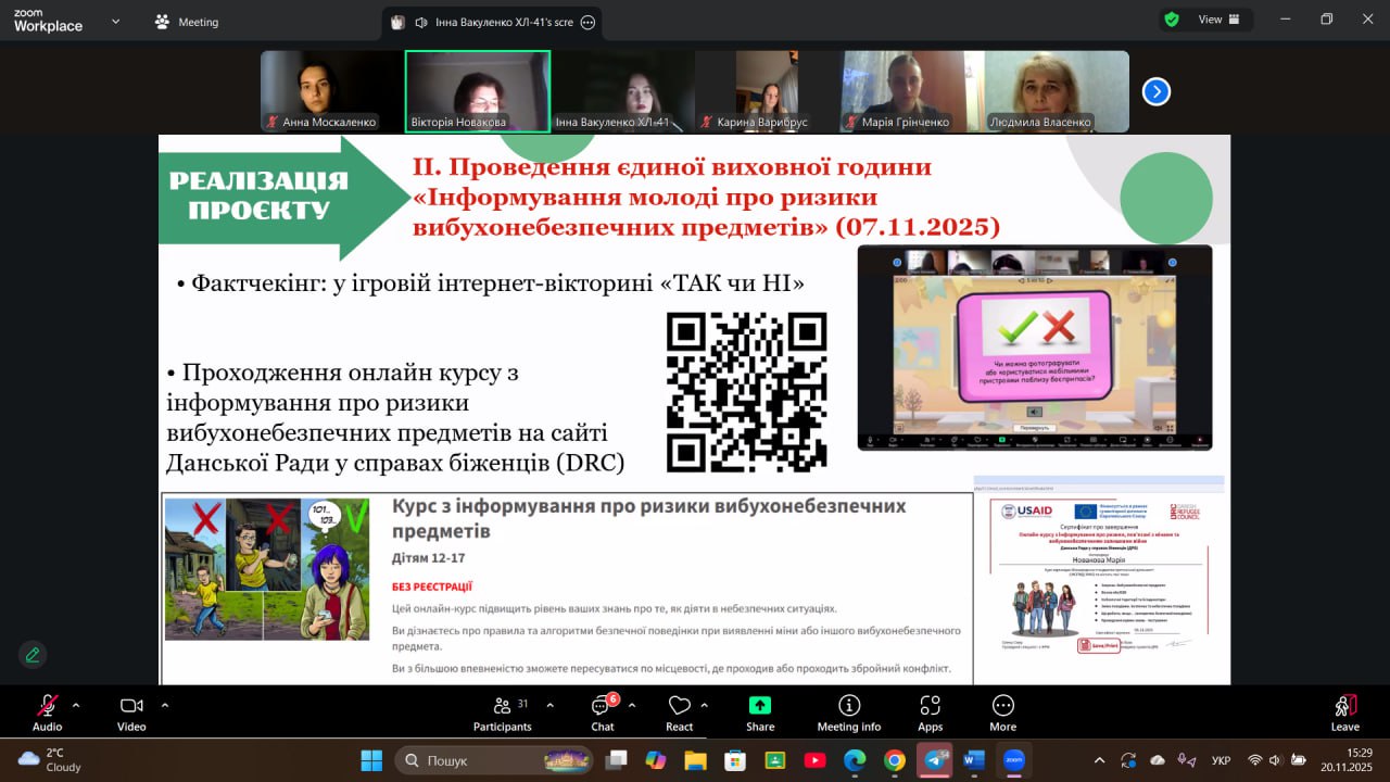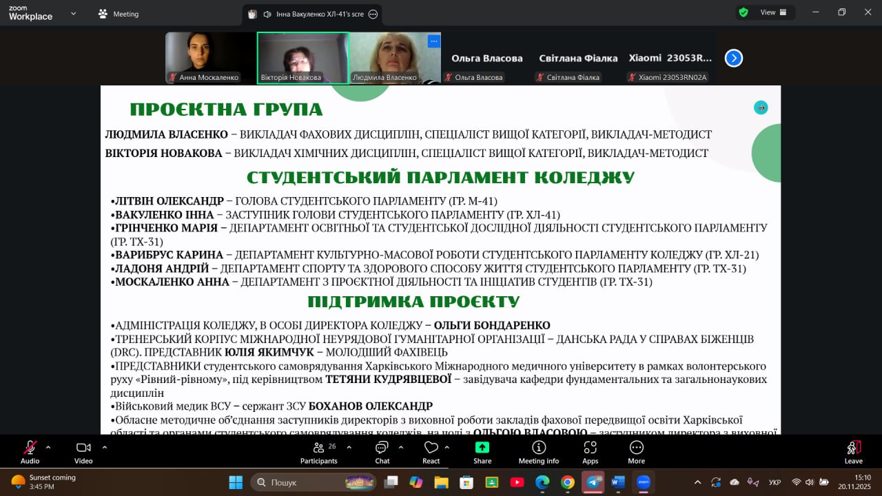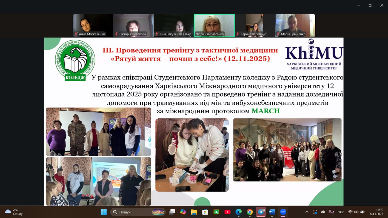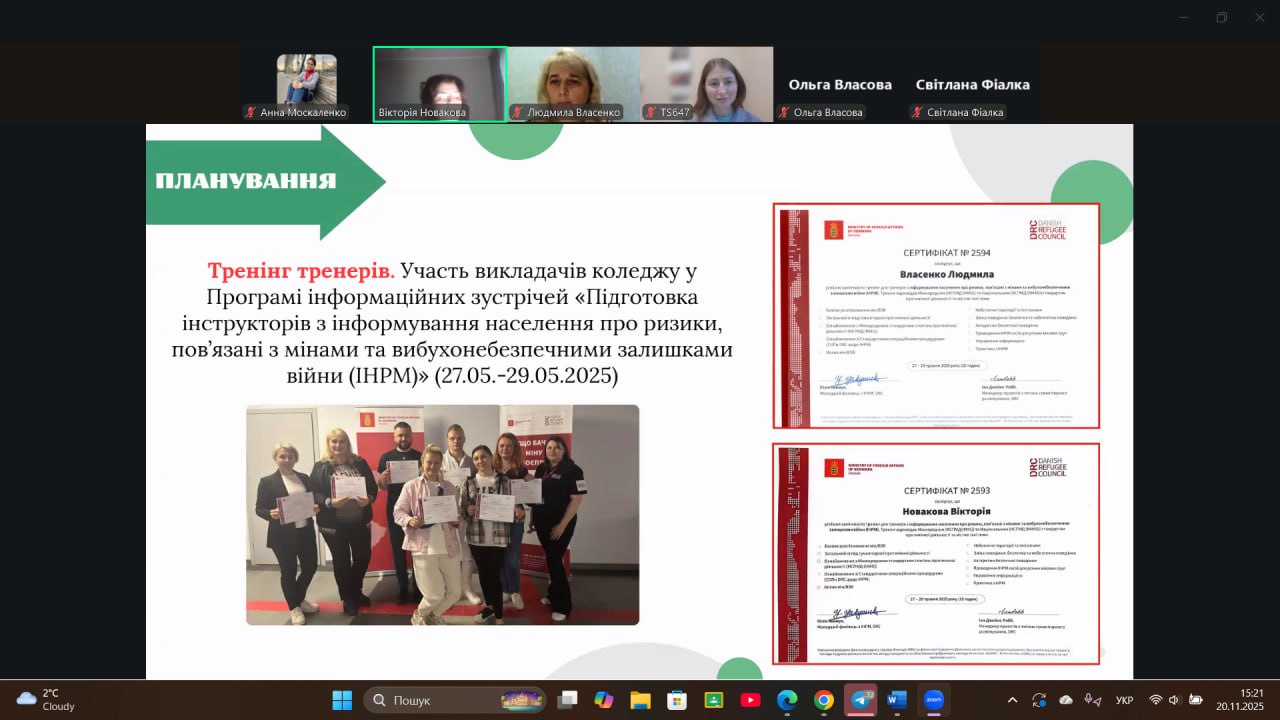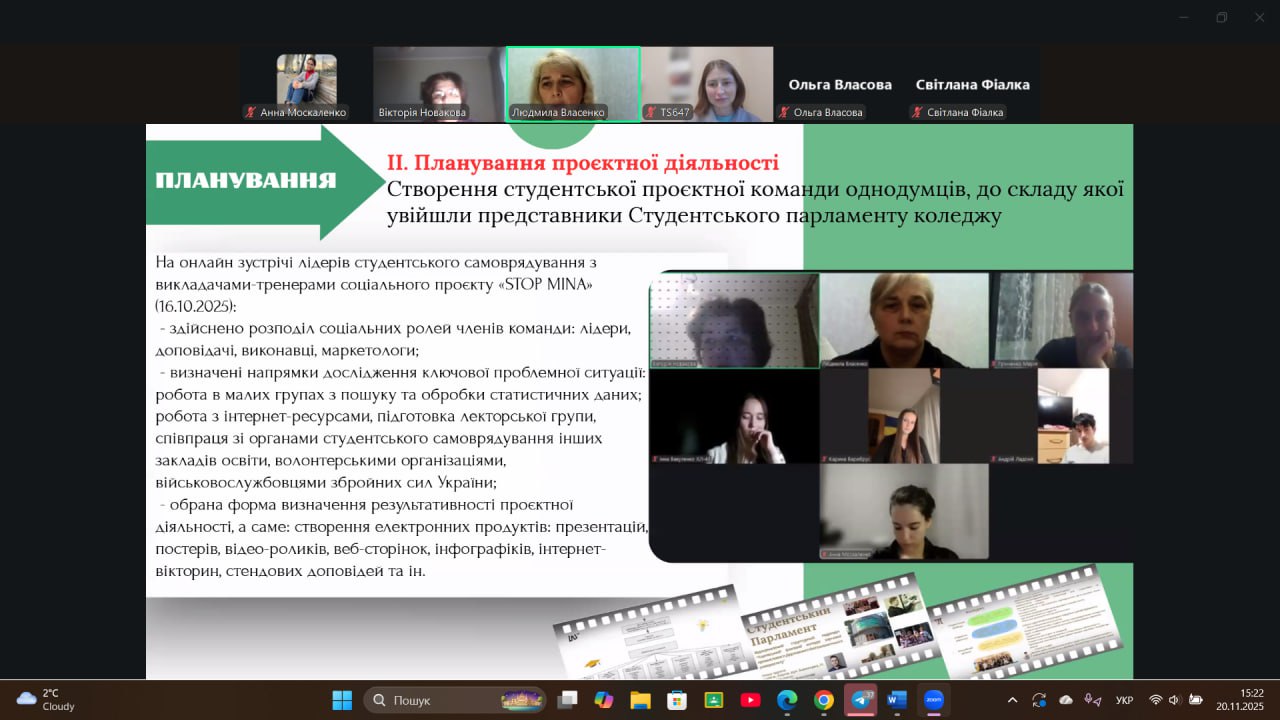 20 листопада 2025 року на засіданні Обласного методичного об’єднання заступників директорів з виховної роботи закладів фахової передвищої освіти Харківської області викладачі коледжу Людмила ВЛАСЕНКО та Вікторія НОВАКОВА представили результати проєктної діяльності, спрямованої на підвищення рівня обізнаності студентської молоді та громадськості щодо мінної небезпеки та загроз від вибухонебезпечних предметів.