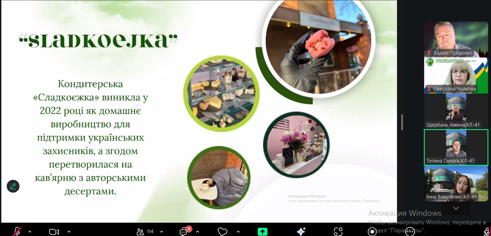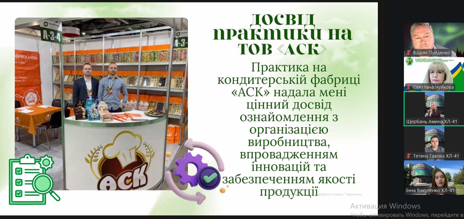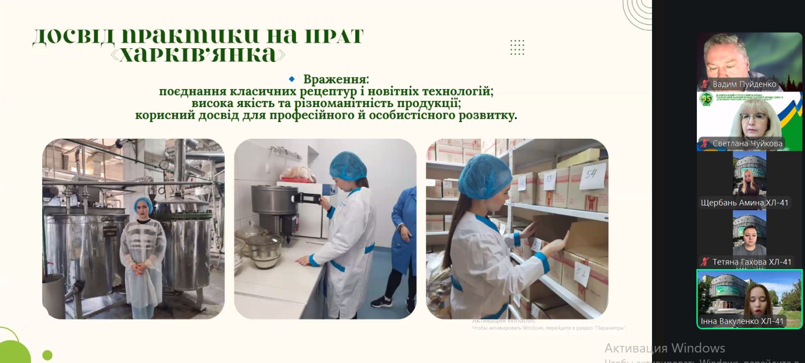 • Студентки групи Хл-41 — Вакуленко Інна, Гахова Таня та Щербань Аміна з презентацією «Традиції, інновації та крафт: досвід практики на кондитерських підприємствах Харківщини» (керівники: Варибрус Вікторія Павлівна, Туз Наталія Вікторівна).