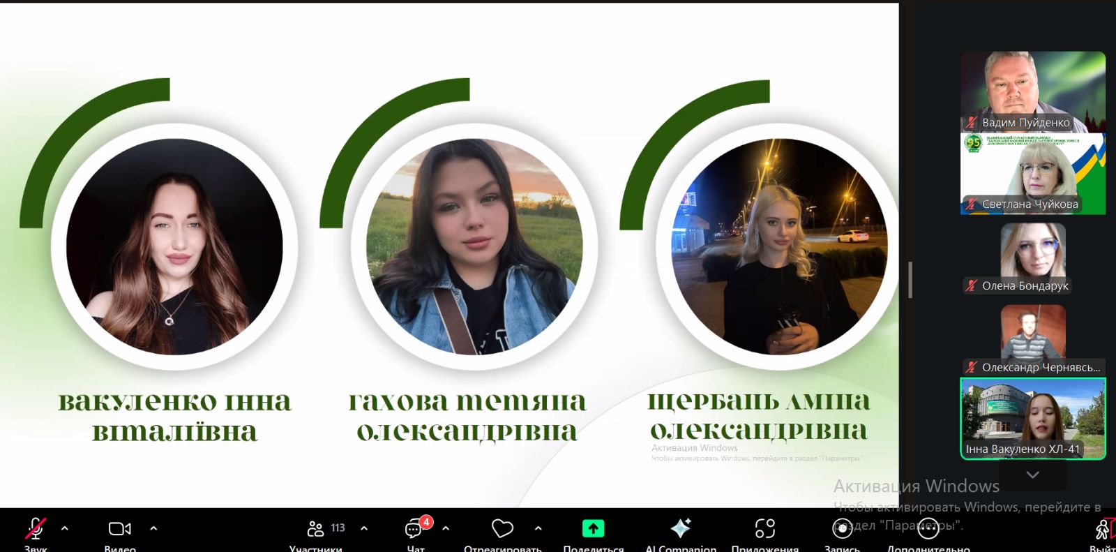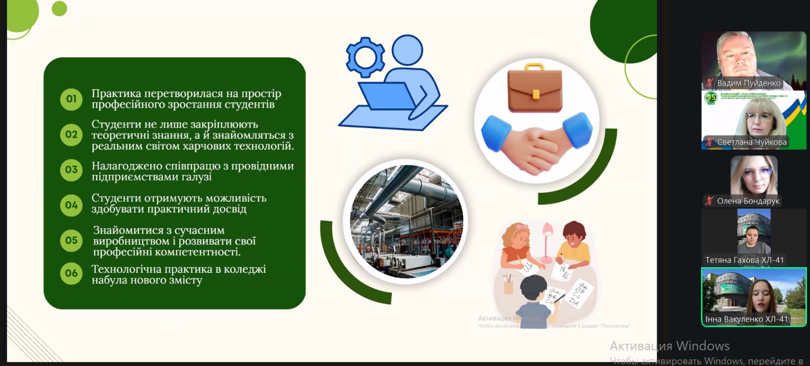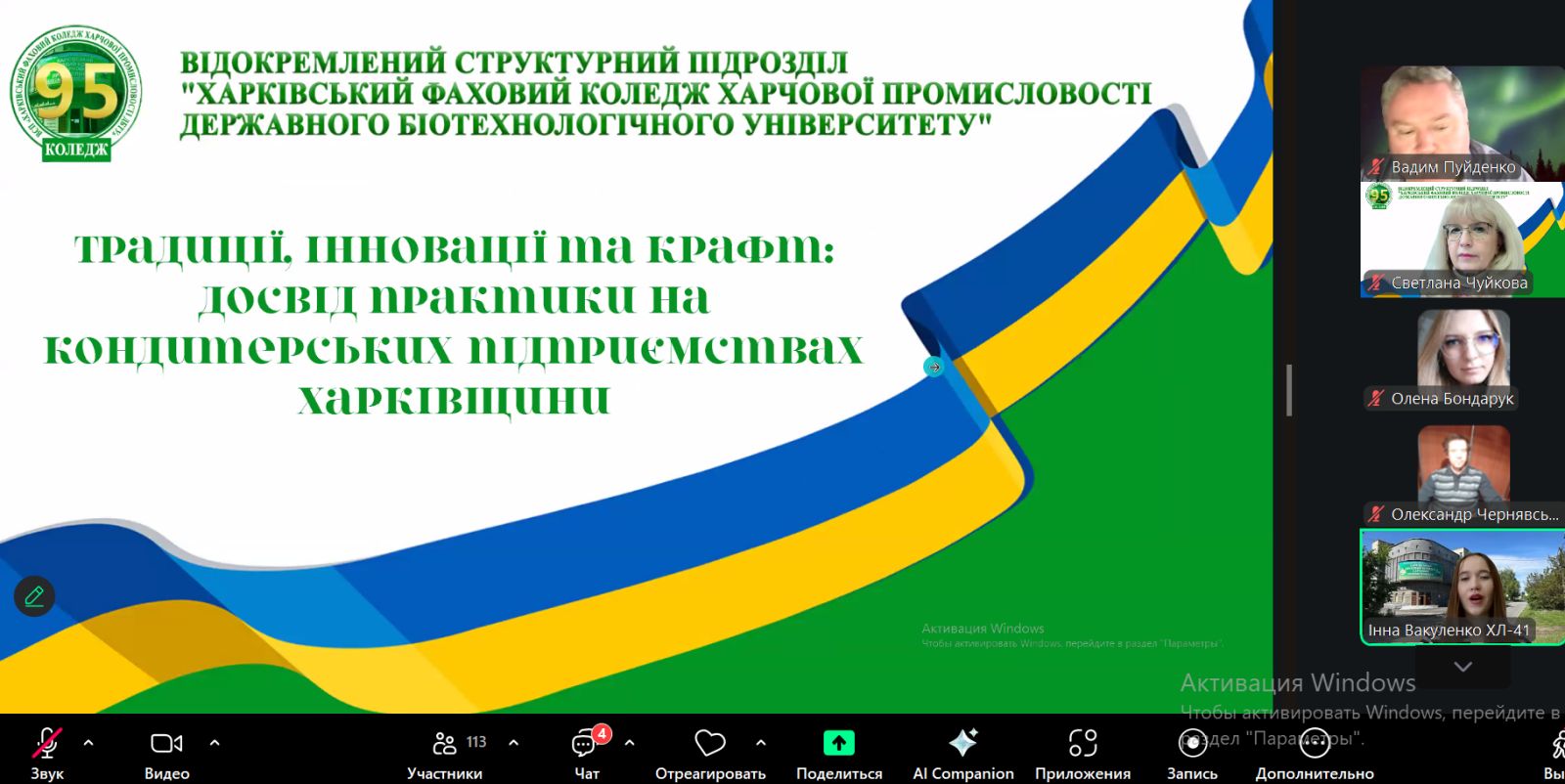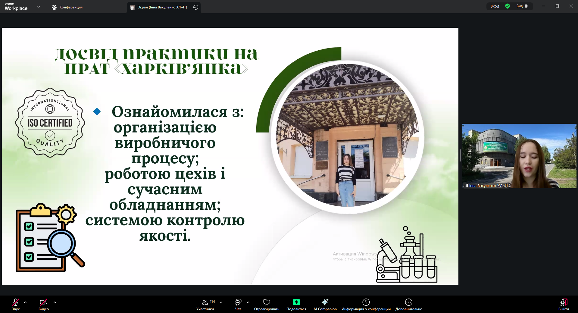 • Студентки групи Хл-41 — Вакуленко Інна, Гахова Таня та Щербань Аміна з презентацією «Традиції, інновації та крафт: досвід практики на кондитерських підприємствах Харківщини» (керівники: Варибрус Вікторія Павлівна, Туз Наталія Вікторівна).