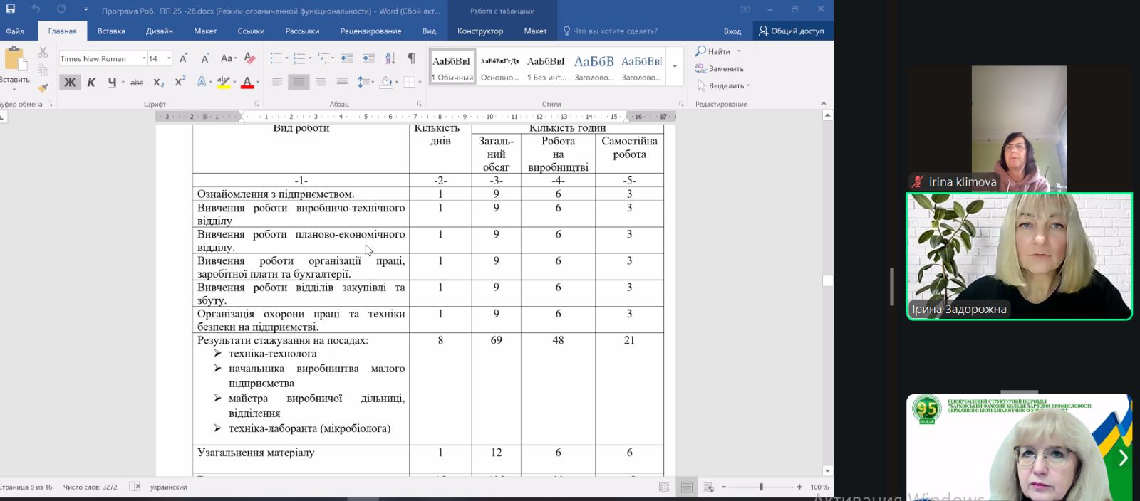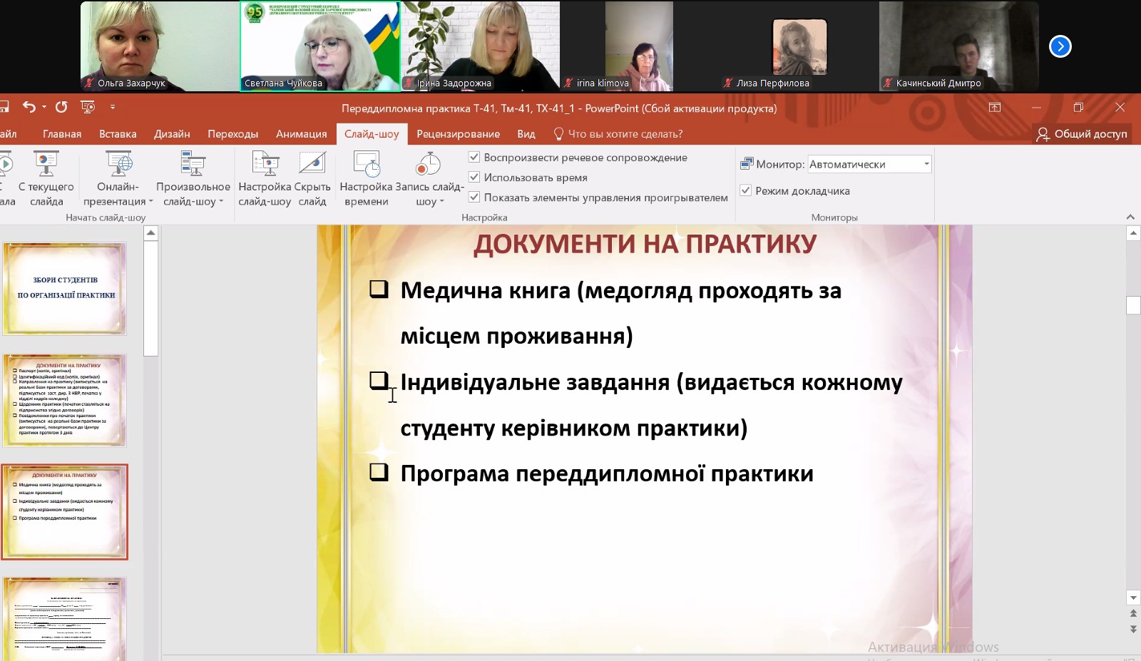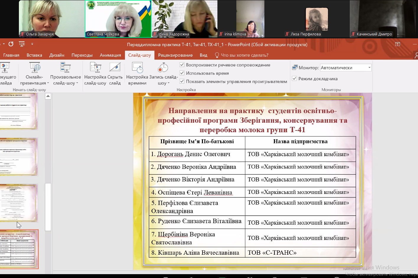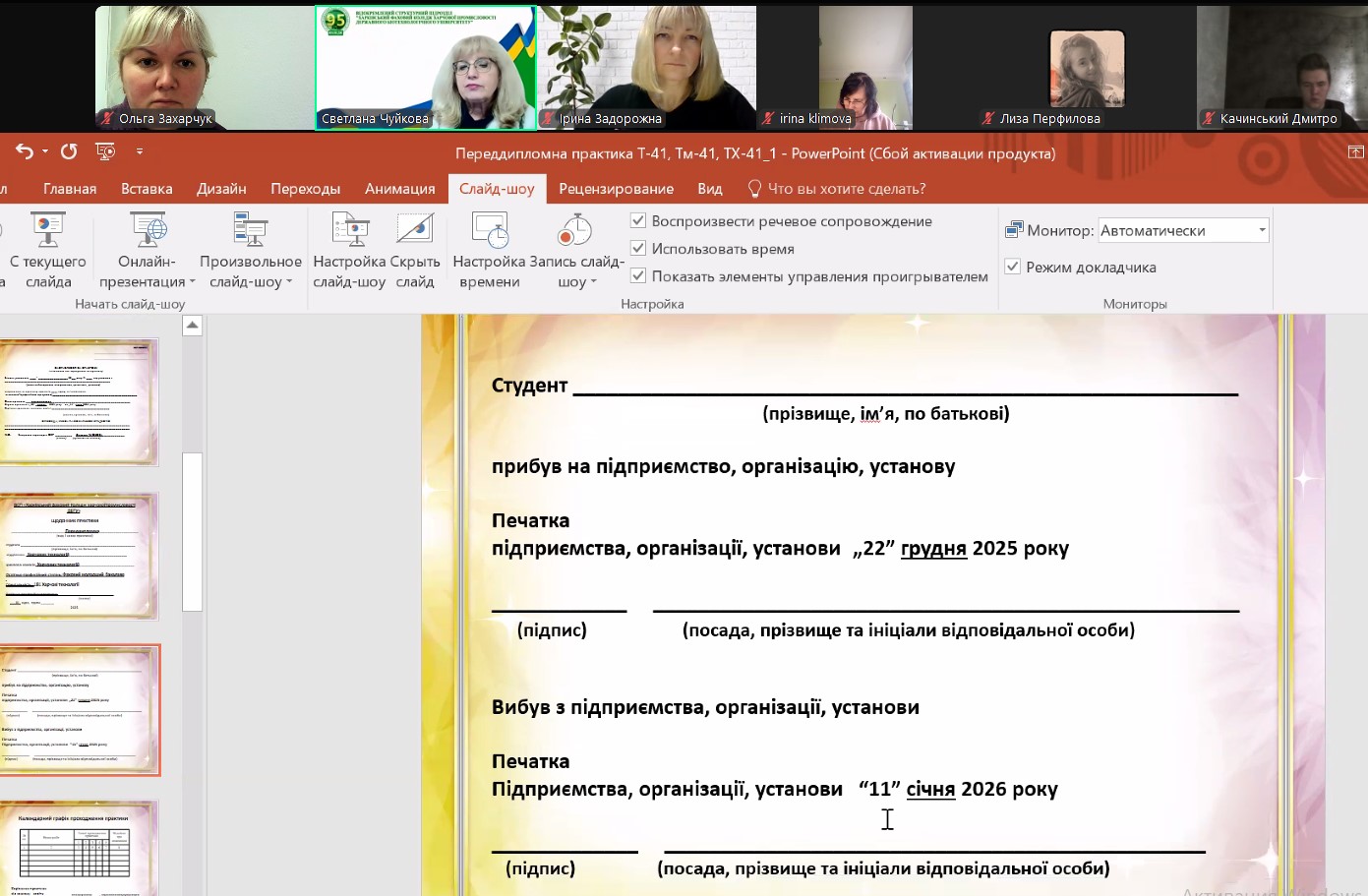 02 грудня 2025 року на платформі ZOOM відбулися збори, присвячені організації та проведенню переддипломної практики для студентів груп Т-41 та ТМ-41 за освітньо-професійними програмами «Зберігання, консервування та переробка молока» та «Зберігання, консервування та переробка м’яса».