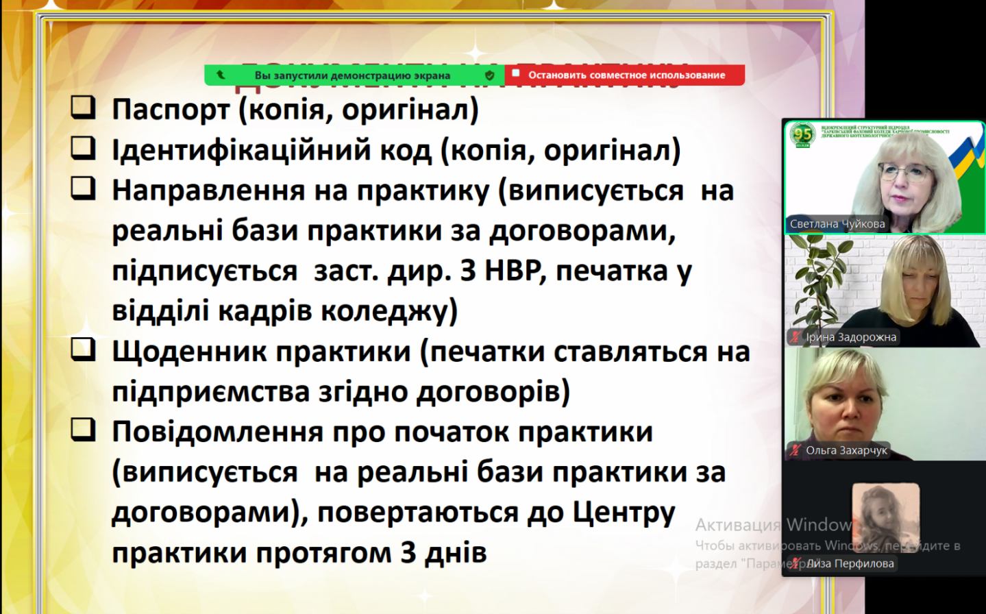 Керівники практики Ірина Анатоліївна КЛІМОВА та Ірина Сергіївна ЗАДОРОЖНА надали роз’яснення щодо виконання й оформлення звіту, представили методичні вказівки та нагадали про можливості й порядок користування навчальною платформою LCloud.