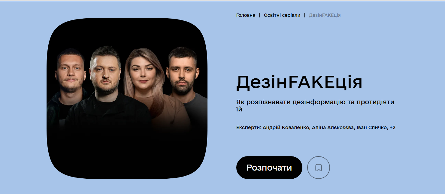 Освітній серіал «ДезінFAKEкція» доступний на порталі Дія.Освіта за посиланням: https://osvita.diia.gov.ua/courses/disinfaketion