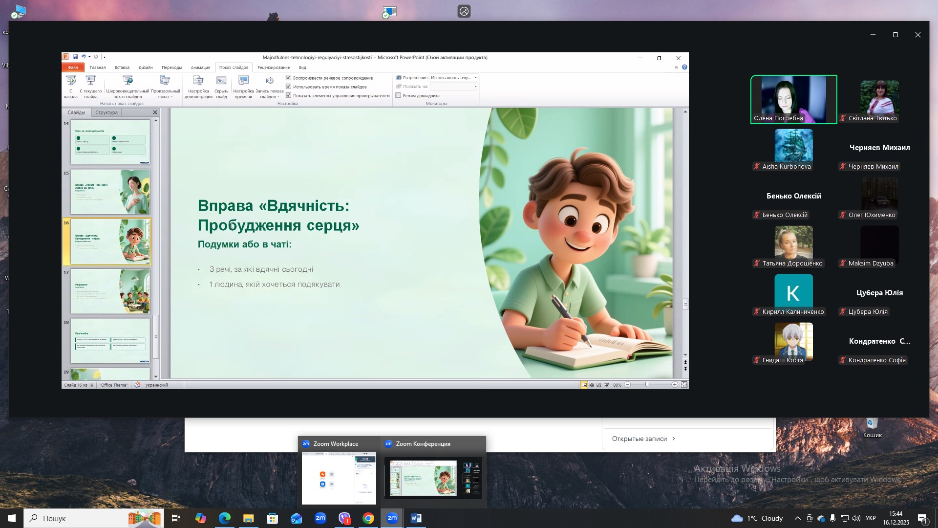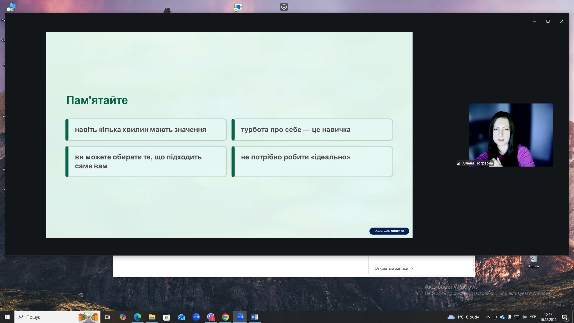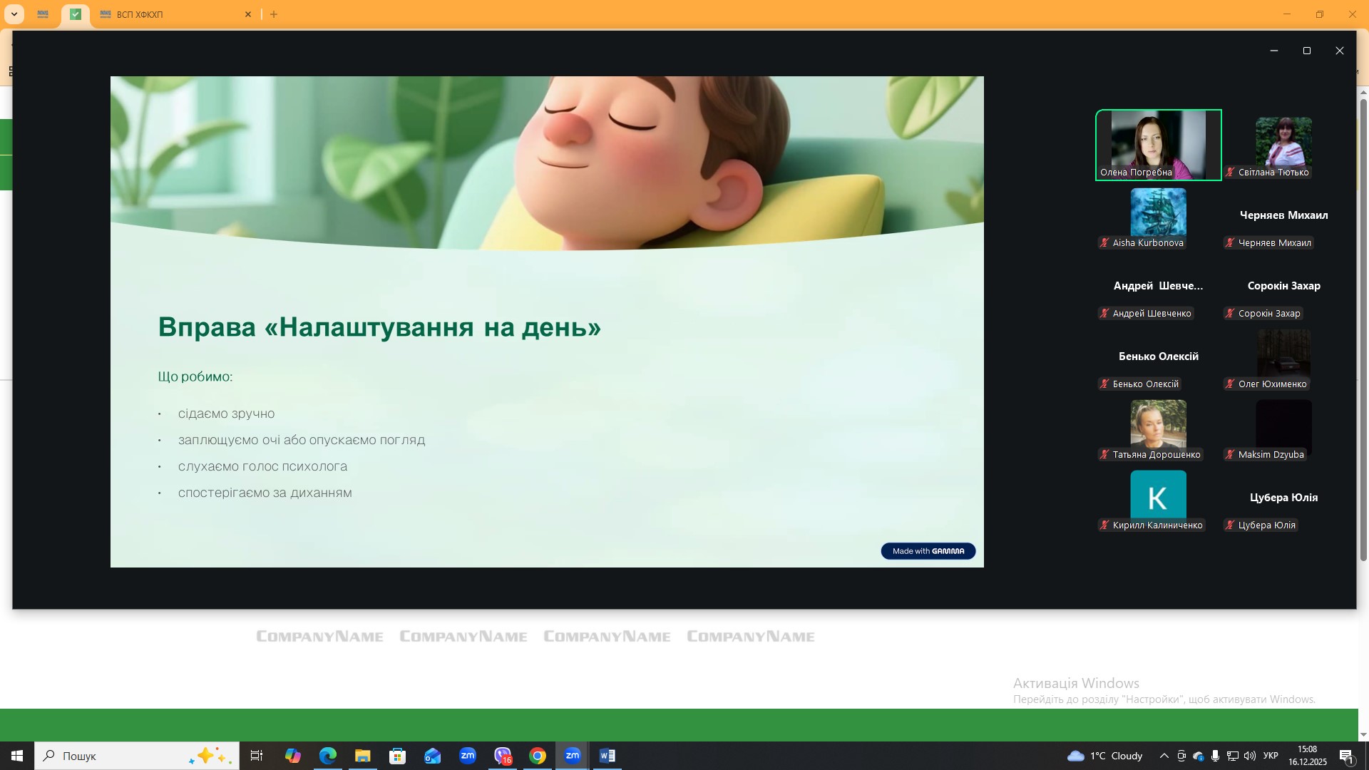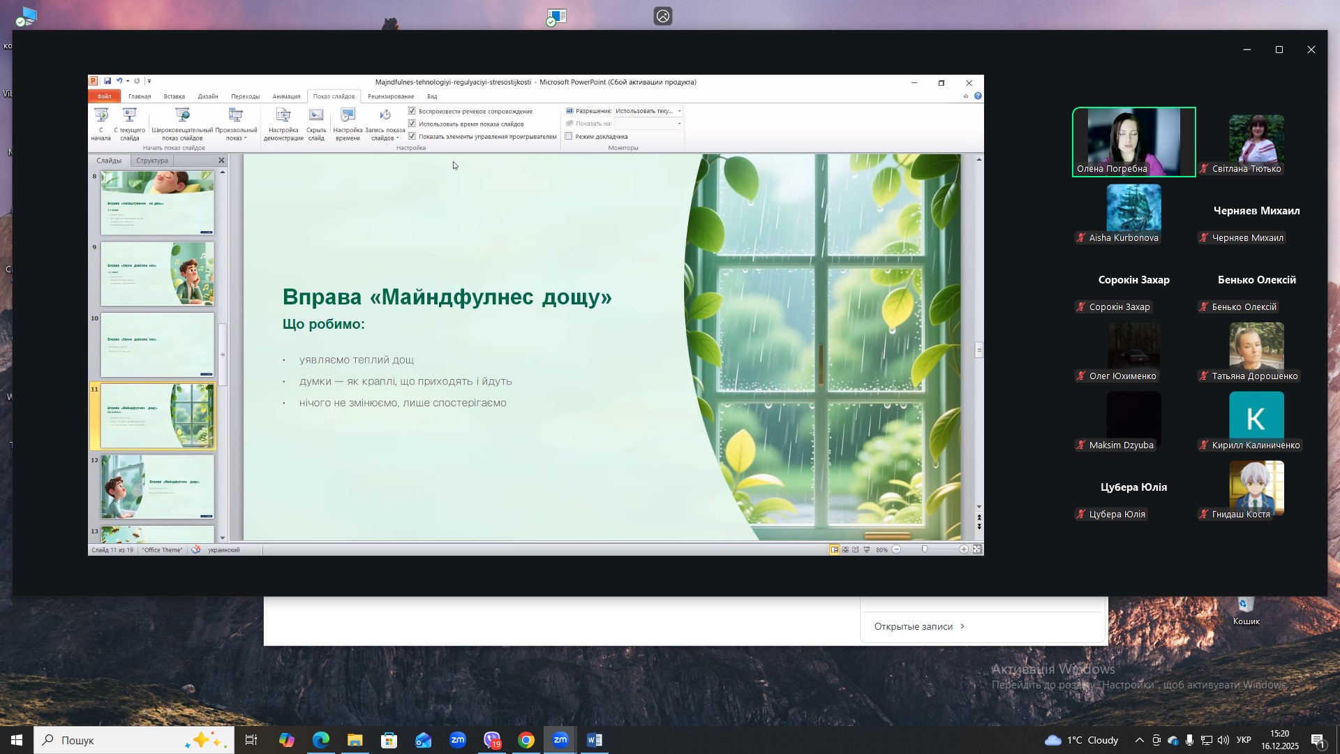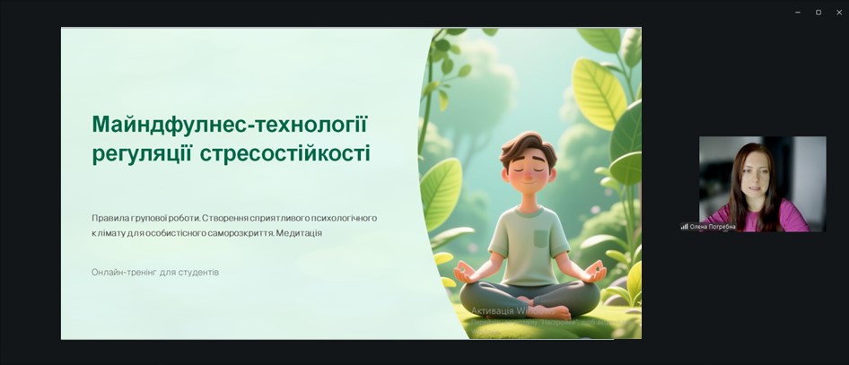 16 грудня 2025 року у коледжі було проведено онлайн-тренінг для студентів 2 курсу на тему «Майндфулнес-технології регуляції стресостійкості: Медитація», який організувала та провела Олена Юріївна Погребна, практичний психолог коледжу.