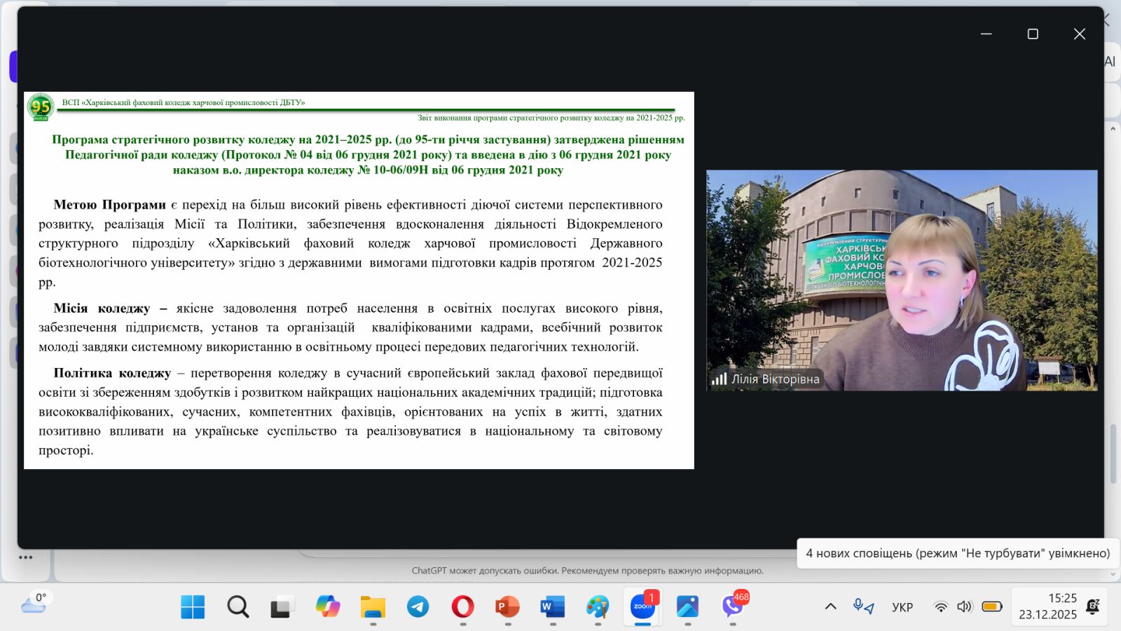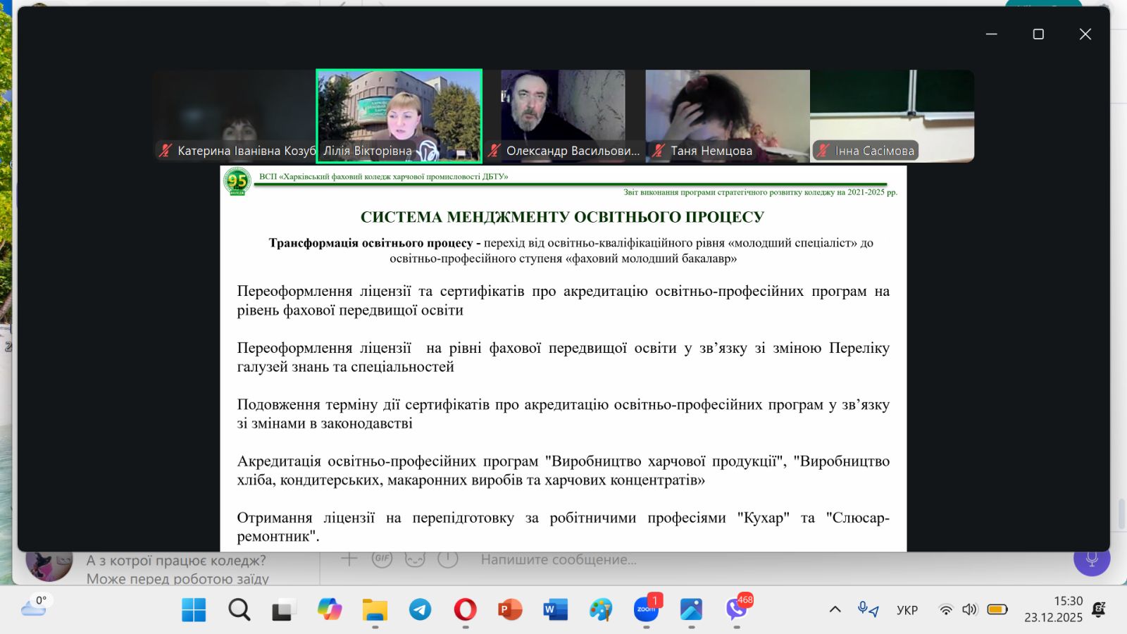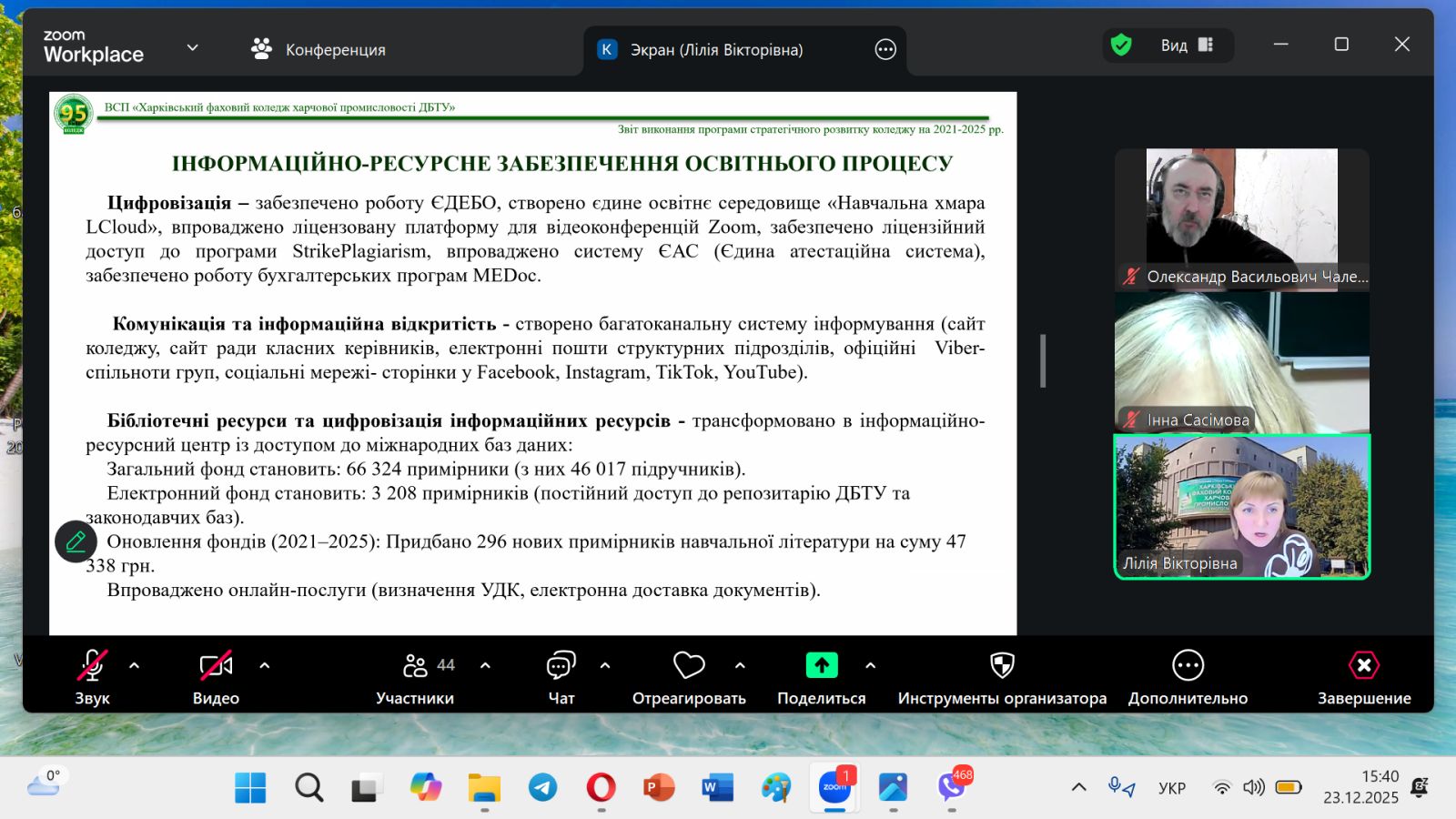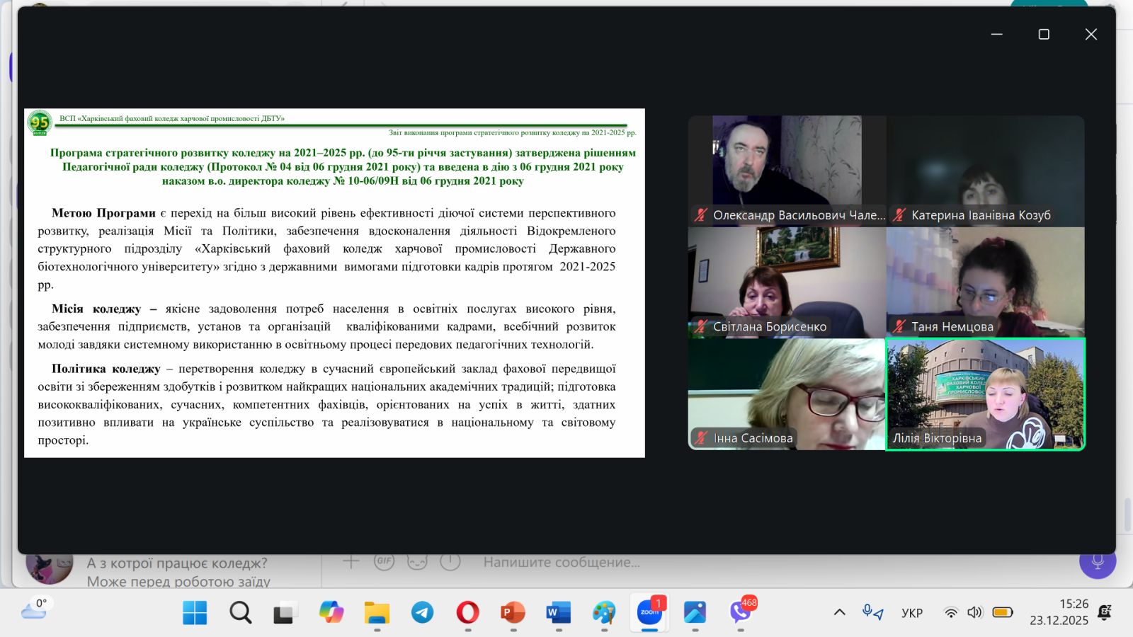 Про підсумки виконання Програми стратегічного розвитку коледжу на 2021–2025 роки доповіла в.о. директора коледжу Бондаренко О.М. У виступі було проаналізовано досягнення, реалізовані заходи та визначено перспективні напрями подальшого розвитку закладу освіти.