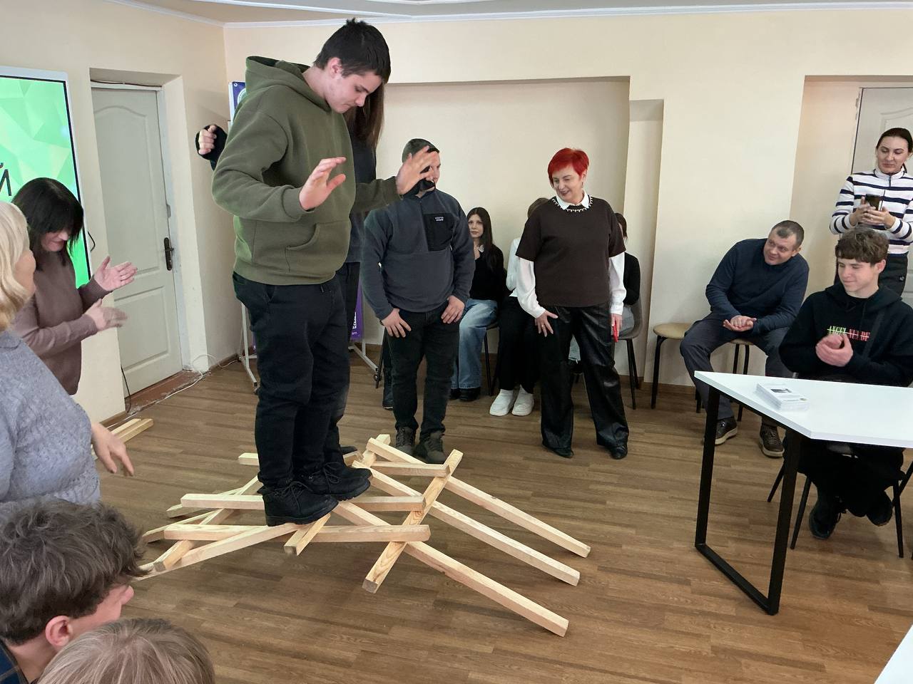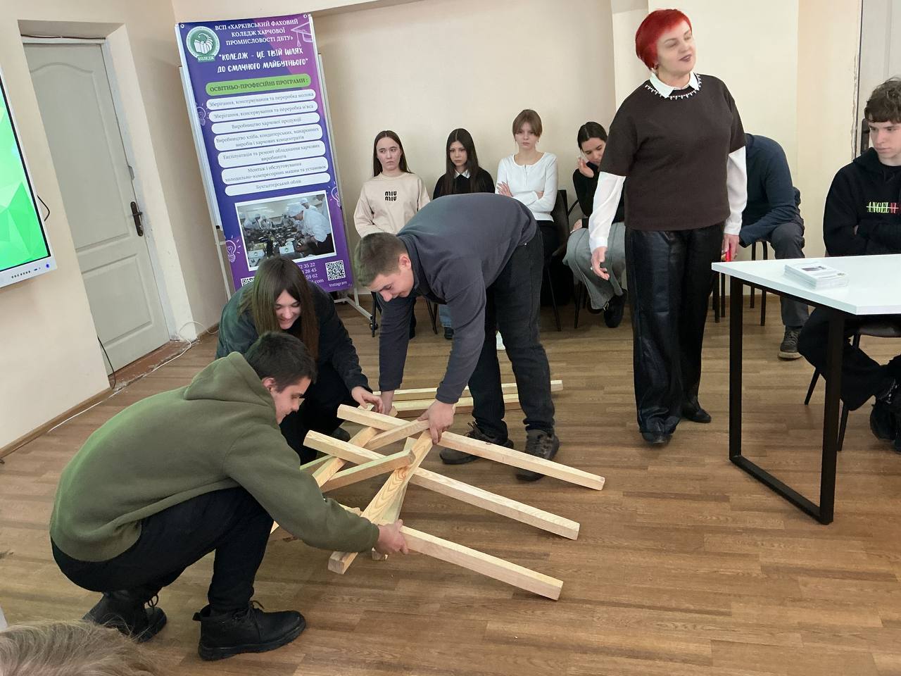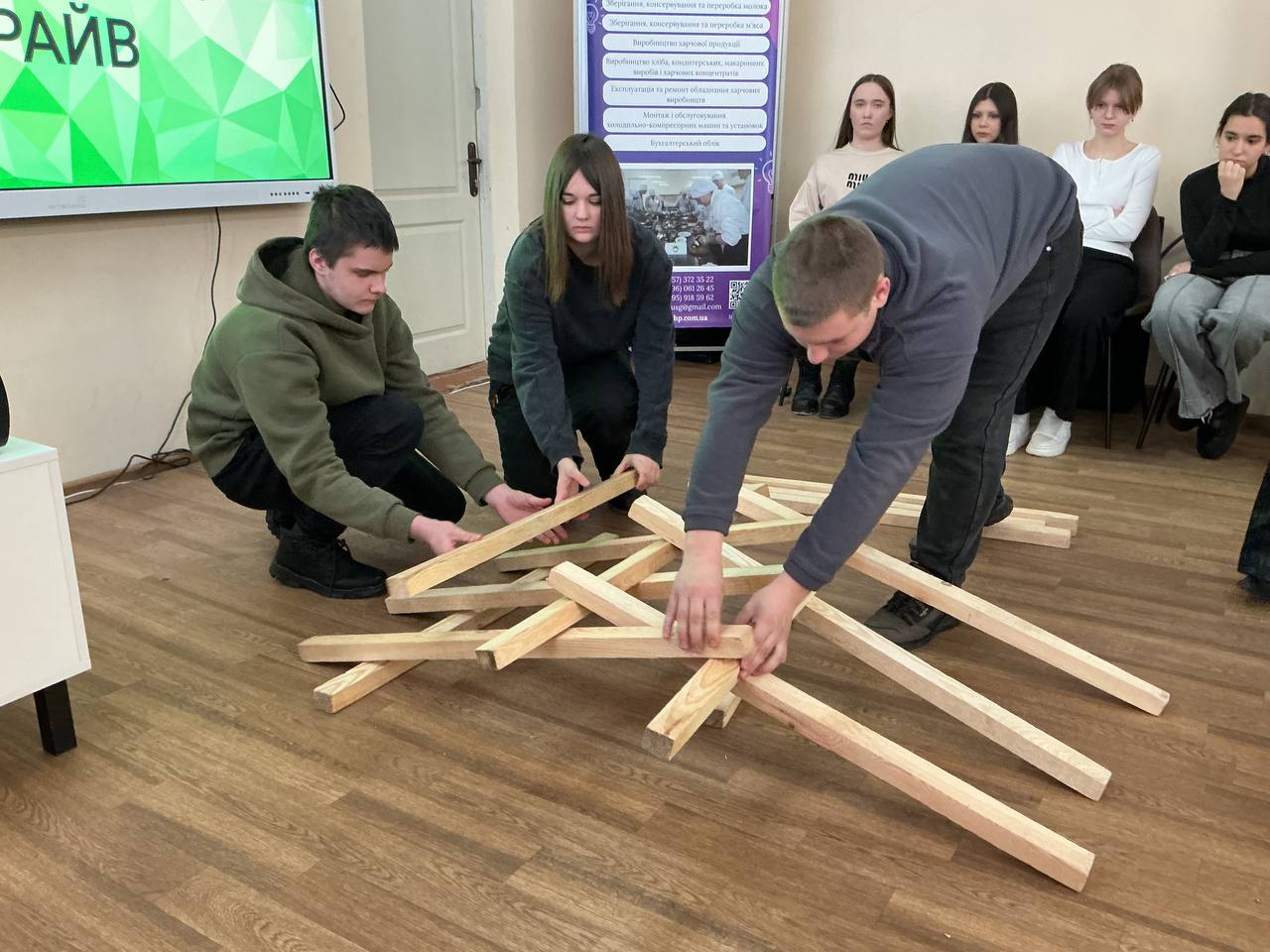 Студенти Москалець Анна, група Тх-31, та Інна Вакуленко, група ХЛ-41, провели інтерактивний майстер-клас «Запальний драйв», демонструючи цікаві й захоплюючі досліди з хімії та фізики. Учні активно долучалися до експериментів зі змішування хімічних реактивів. Студенти Дар’я Олефір, Богдан Юдін, Максим Комар, групи ТММ-11, Х-21, Мх-11. збирали диво техніки – міст Леонардо да Вінчі та випробовували його на міцність.