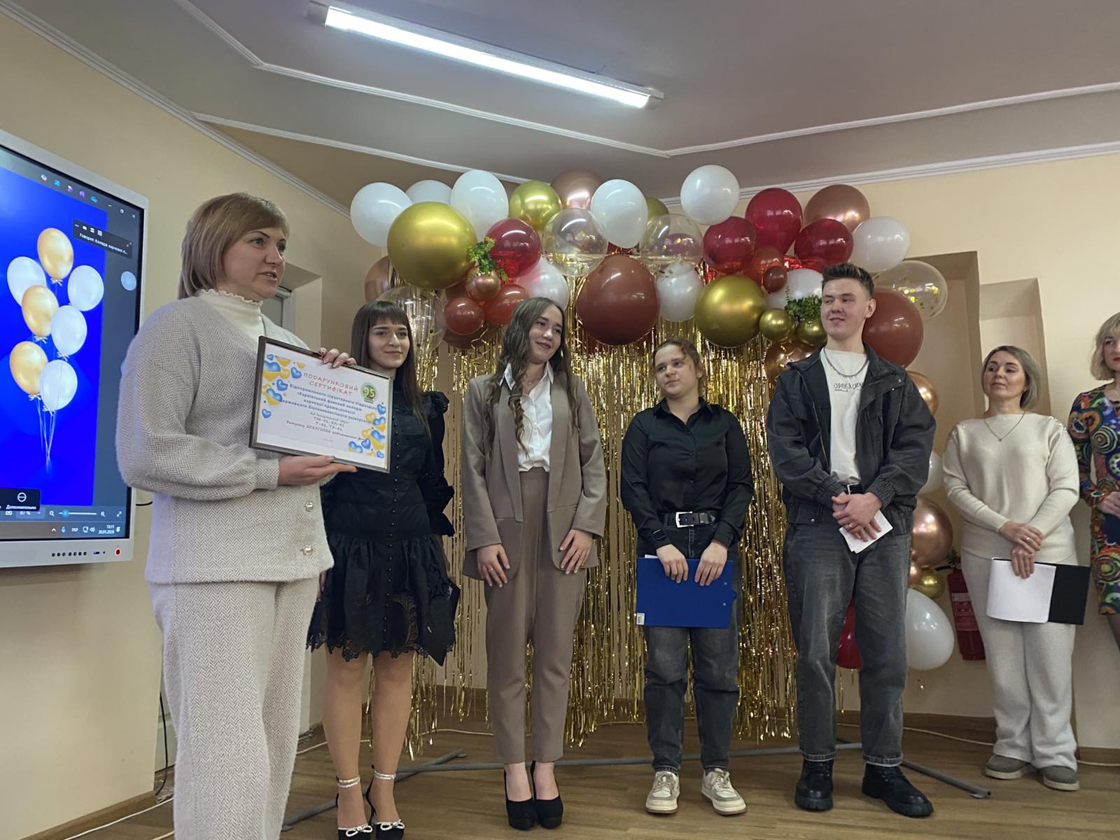 Старости випускних груп Інна ВАКУЛЕНКО, Діана ШКРЬОБА, Вікторія ДЯЧЕНКО та Дмитро КАЧИНСЬКИЙ подякували адміністрації коледжу, викладачам, батькам за створення умов для розвитку, за підтримку та віру, за те, що щодня ділилися знаннями, досвідом і натхненням, навчили мислити творчо, працювати наполегливо й цінувати професію. Від імені випускників та їх батьків старости вручили подарунковий сертифікат на розвиток матеріально-технічної бази коледжу.