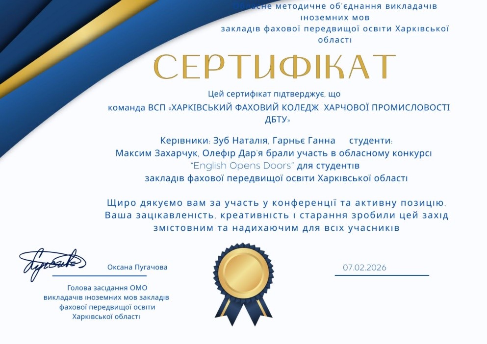 7 лютого 2026 року обласним методичним об’єднанням викладачів іноземних мов закладів фахової передвищої освіти Харківської області було проведено творчий конкурс відеопрезентацій «English Opens Doors».