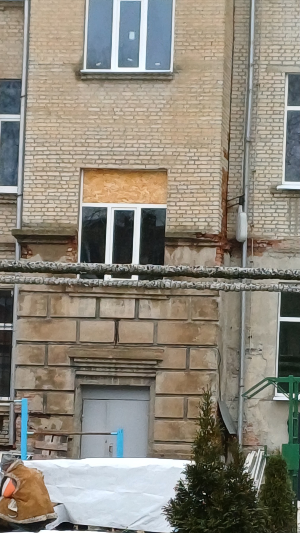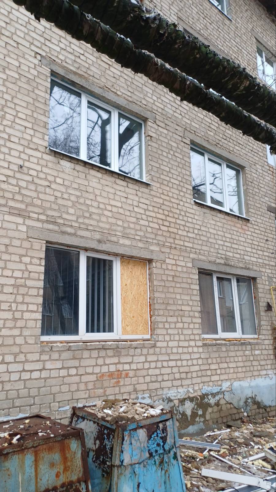 Пошкоджені вікна та вхідні групи, які потребують заміни.