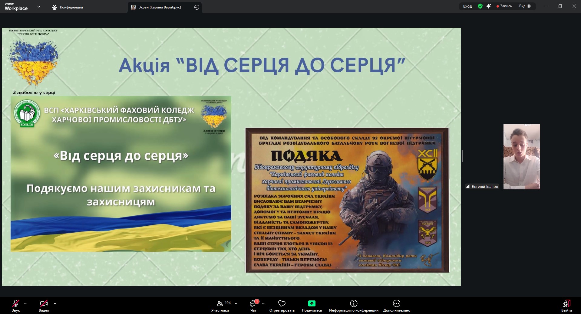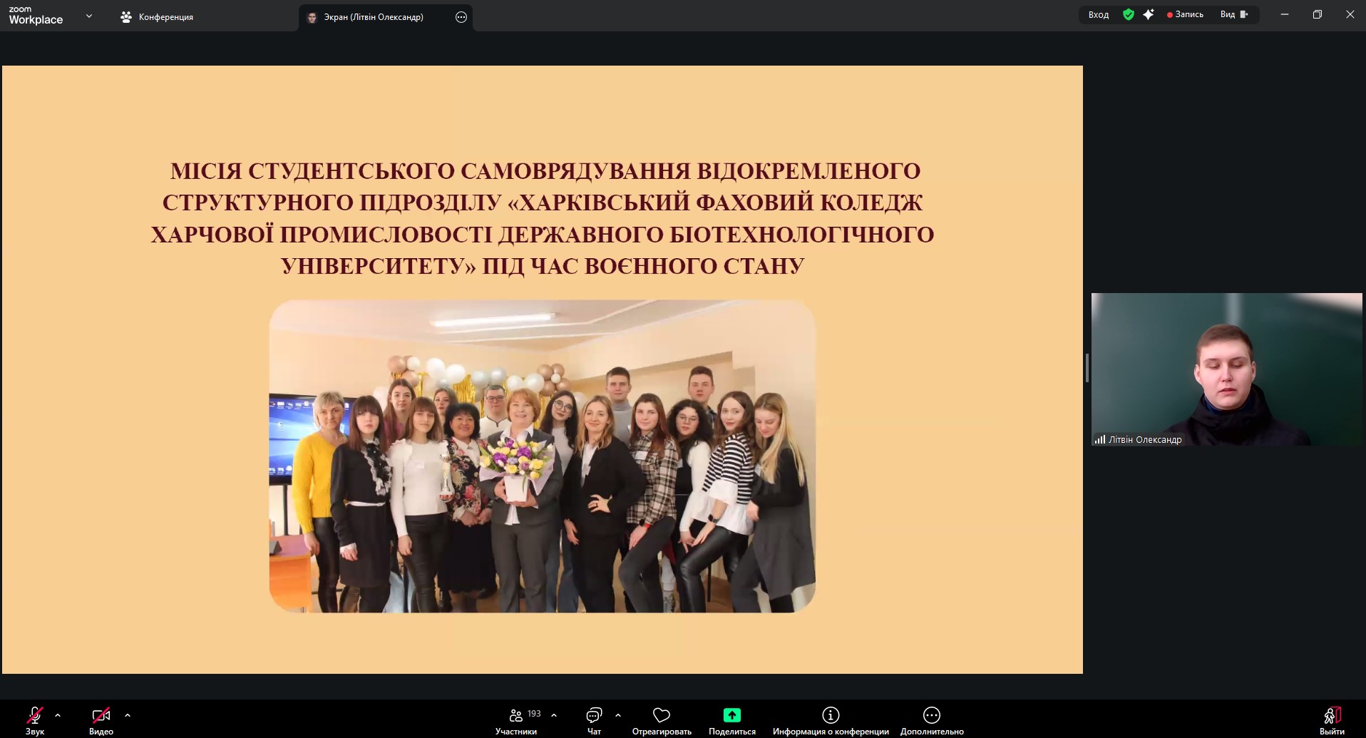 З доповідями від коледжу виступили викладачі та здобувачі освіти. Голова студентського парламенту Олександр Літвін представив доповідь «Місія студентського самоврядування відокремленого структурного підрозділу “Харківський фаховий коледж харчової промисловості Державного біотехнологічного університету” під час воєнного стану».