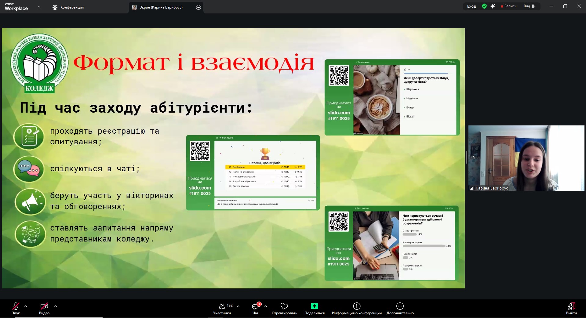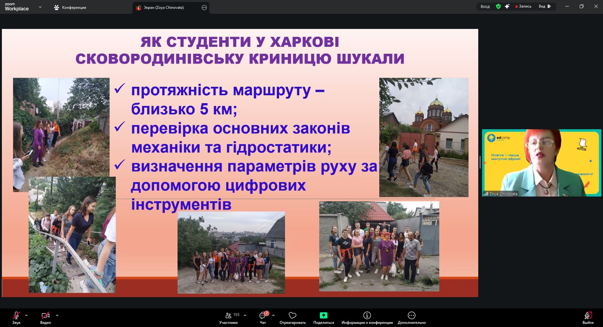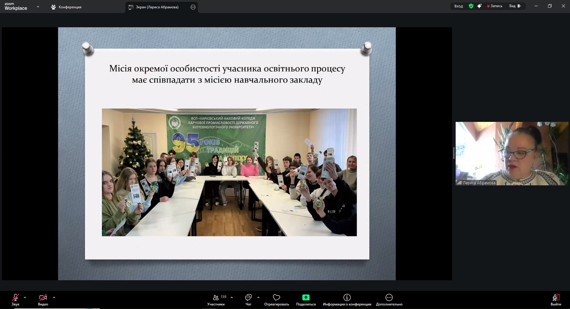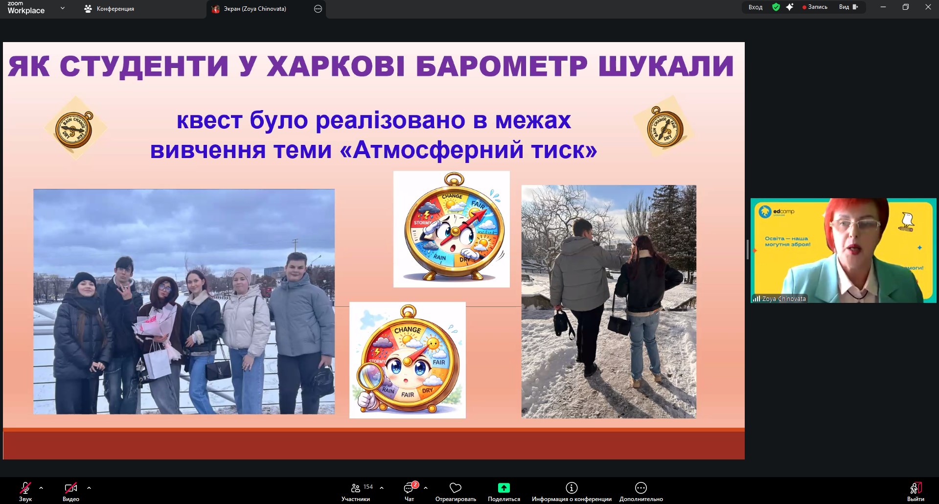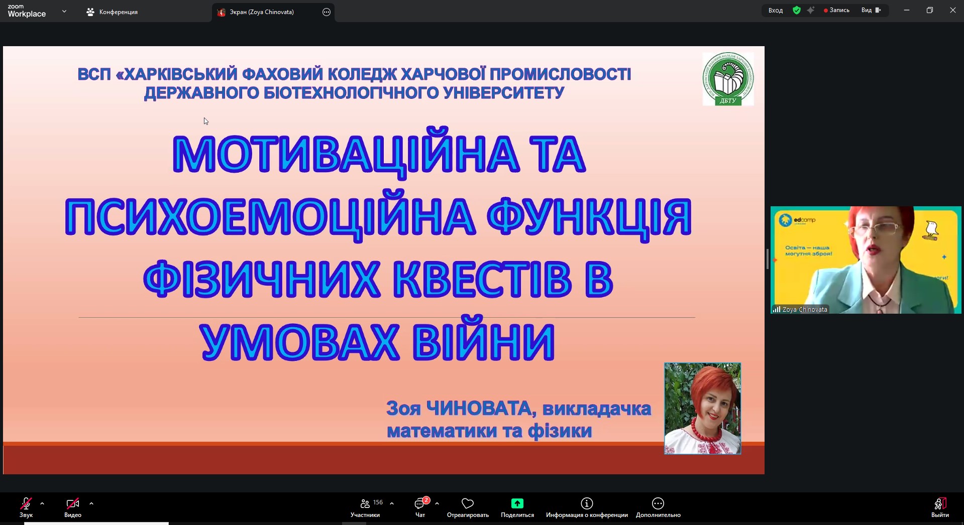Викладач фізики Зоя Чиновата розкрила тему мотиваційної та психоемоційної функції фізичних квестів в умовах війни. Викладач географії Лариса Абрамова представила доповідь «Основні положення педагогіки співпраці в умовах воєнного часу».