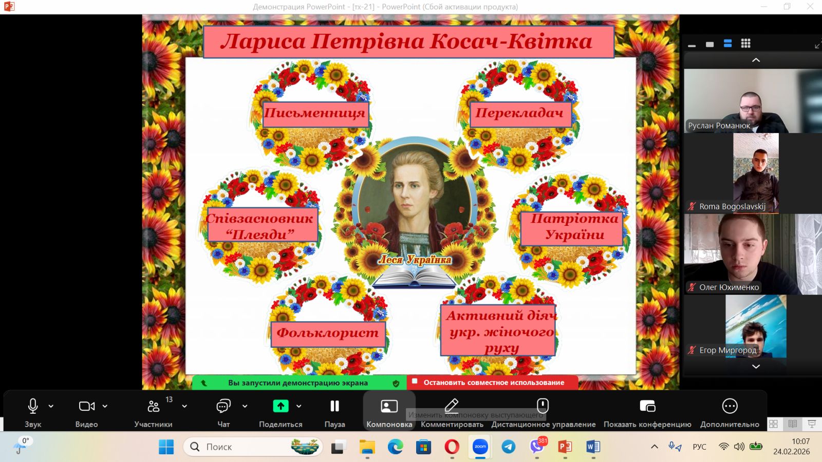 Відкриттям тематичного тижня стала літературна година «Леся Українка — символ незламності українського духу», під час якої студенти ознайомилися з маловідомими фактами з життя поетеси, переглянули відеофрагменти, обговорили її роль у розвитку української літератури. Особливу увагу було приділено творам, що стали духовними орієнтирами для багатьох поколінь.