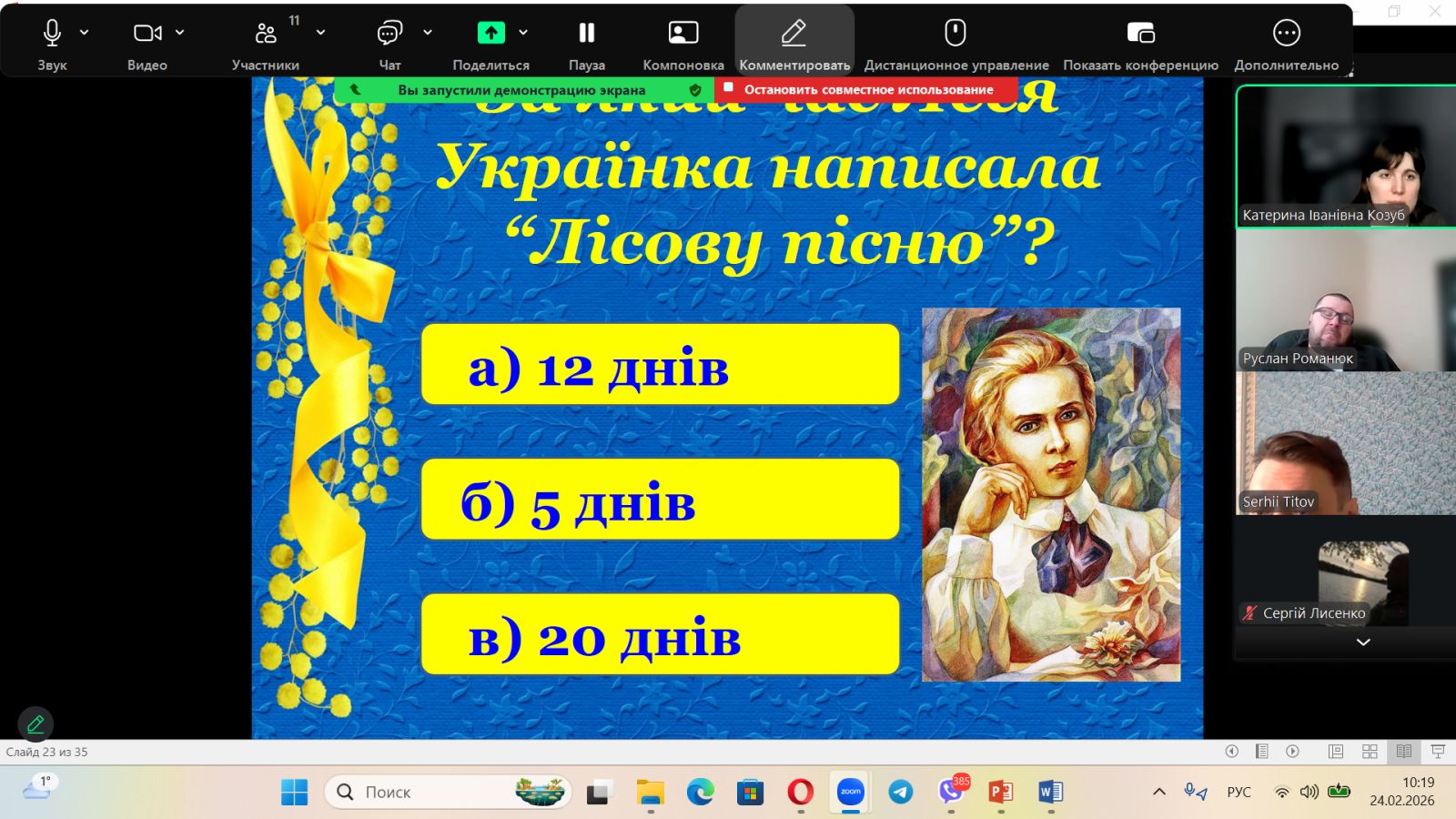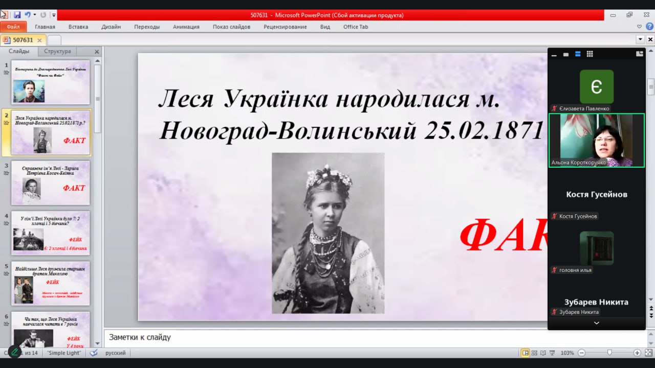 Творчим завершенням тижня стала інтерактивна вікторина «Чи знаємо ми Лесю Українку?». Учасники продемонстрували ґрунтовні знання біографії та творчості поетеси, а також вміння працювати в команді.