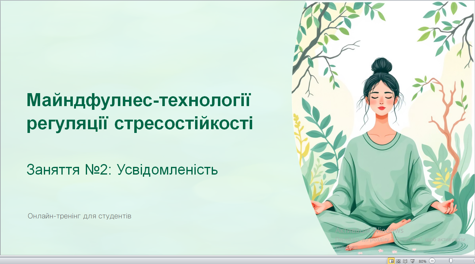 Під час зустрічі учасники ознайомилися з поняттям усвідомленості як здатності бути «тут і зараз», без зайвого самокритичного оцінювання власних думок і почуттів. Практична частина включала вправи з концентрації уваги, дихальні техніки, медитації «Я – небо», «Майндфулнес усмішки», роботу з непростими емоціями та формування доброзичливого ставлення до себе й інших.