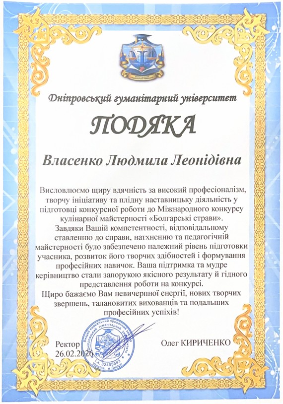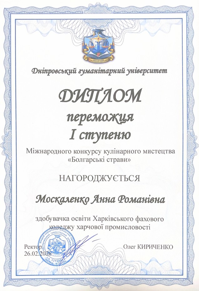 За результатами конкурсу (26.02.2026) Москаленко Анна здобула Диплом І ступеня, продемонструвавши високий рівень професійної підготовки, творчий підхід та майстерність у відтворенні традицій болгарської кухні.