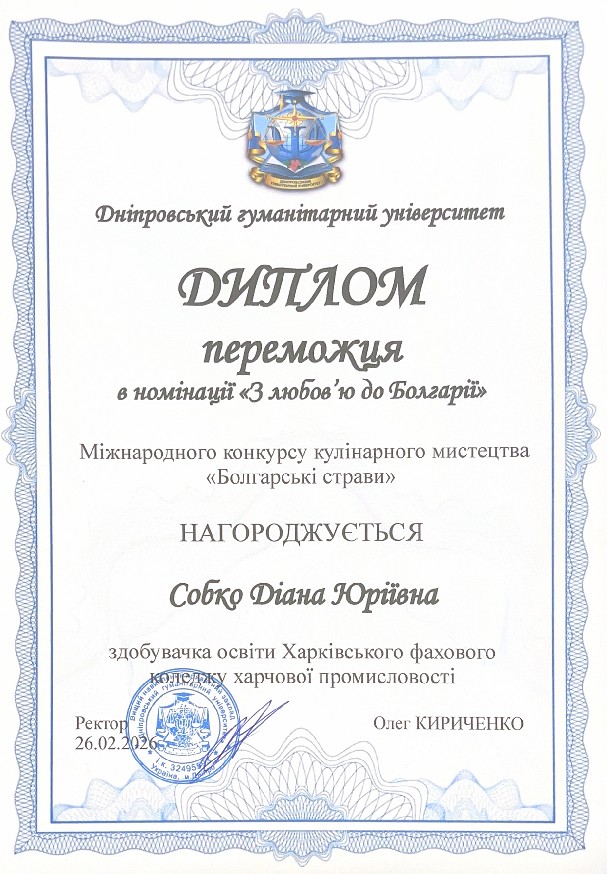 Конкурсну роботу Собко Діани відзначено дипломом переможця в номінації «З любов’ю до Болгарії», що підкреслює її креативність, естетичність виконання та глибоке розуміння національних кулінарних традицій.