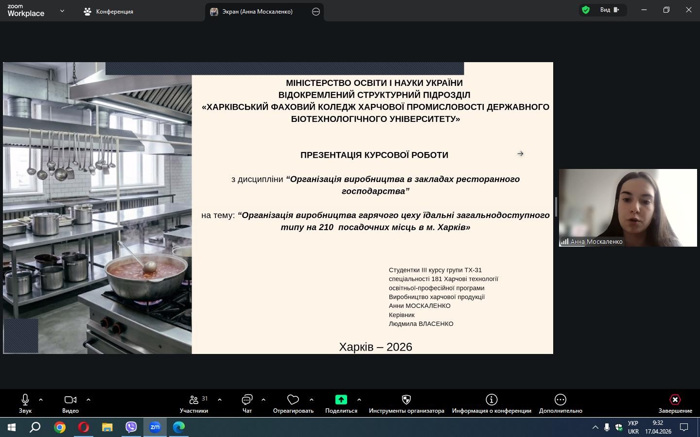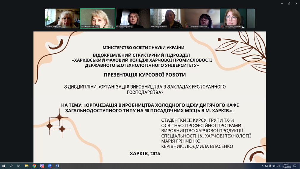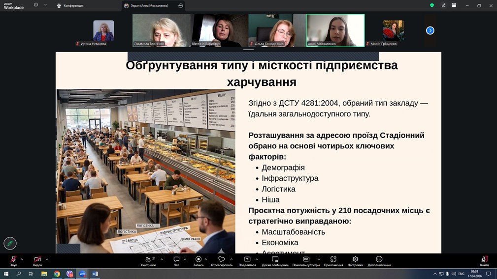 Зокрема, Марія Грінченко представила курсову роботу з організації виробництва холодного цеху дитячого кафе загальнодоступного типу на 50 посадкових місць у м. Харків.; Анна Москаленко захистила роботу щодо організації гарячого цеху їдальні загальнодоступного типу на 210 посадкових місць в м. Харків.