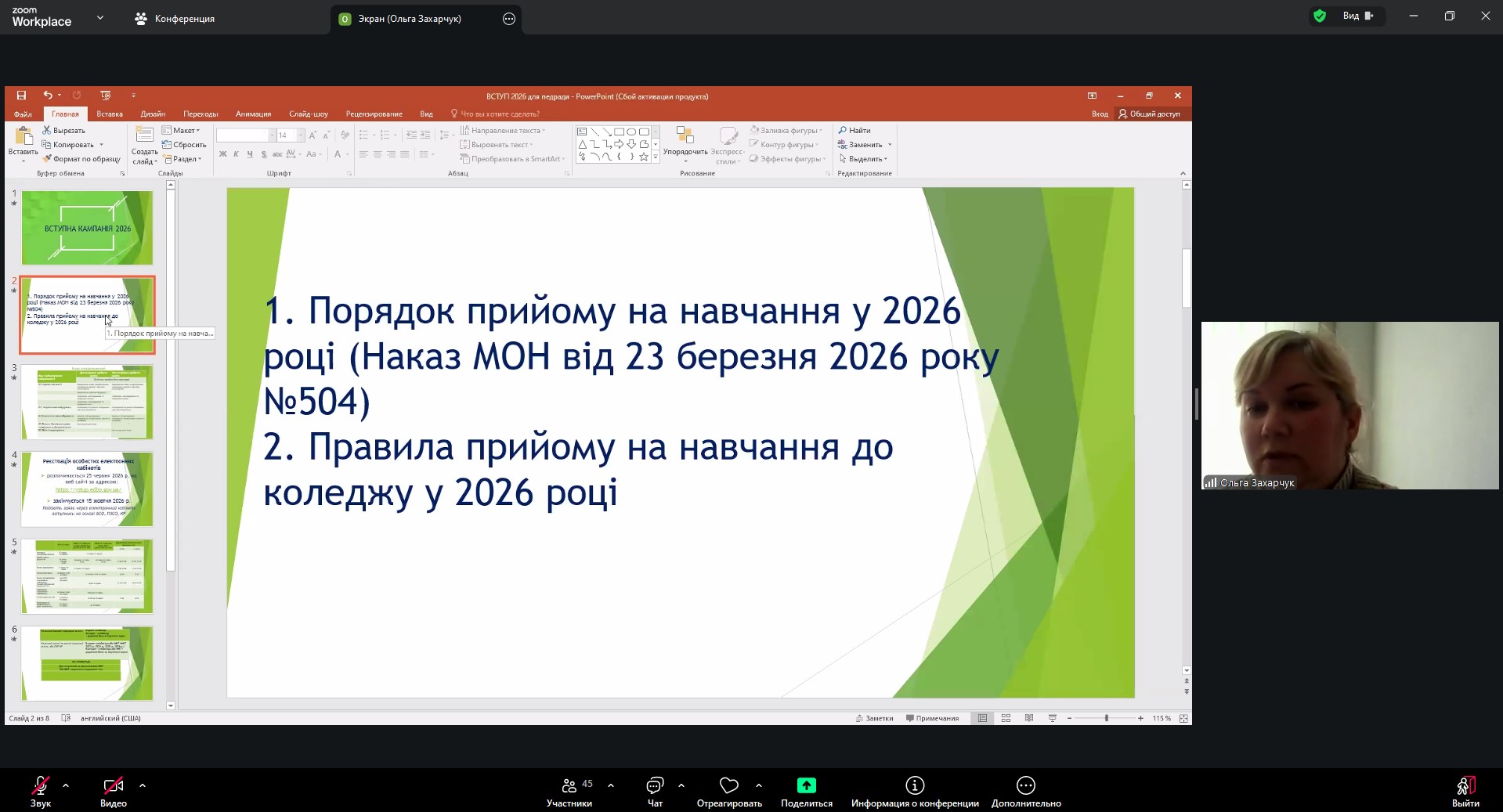 Під час засідання також розглянули питання підготовки до вступної кампанії 2026 року. Відповідальний секретар приймальної комісії Захарчук О.Є. поінформувала про організацію роботи приймальної комісії та представив на затвердження Правила прийому до коледжу на 2026 рік.