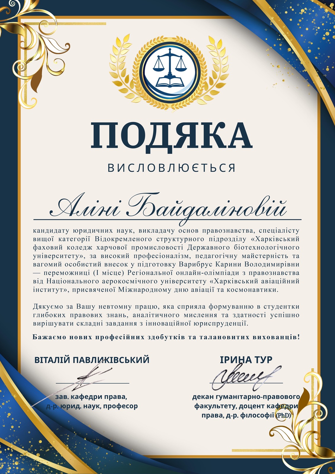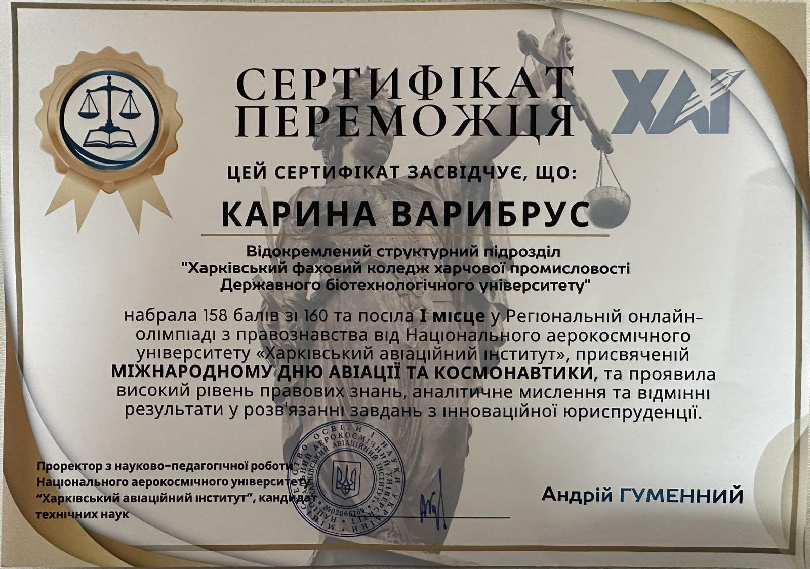 Студентка групи ХЛ-21 Карина Варибрус стала переможницею Регіональної онлайн-олімпіади з правознавства, що відбулася на базі Національного аерокосмічного університету «Харківський авіаційний інститут».